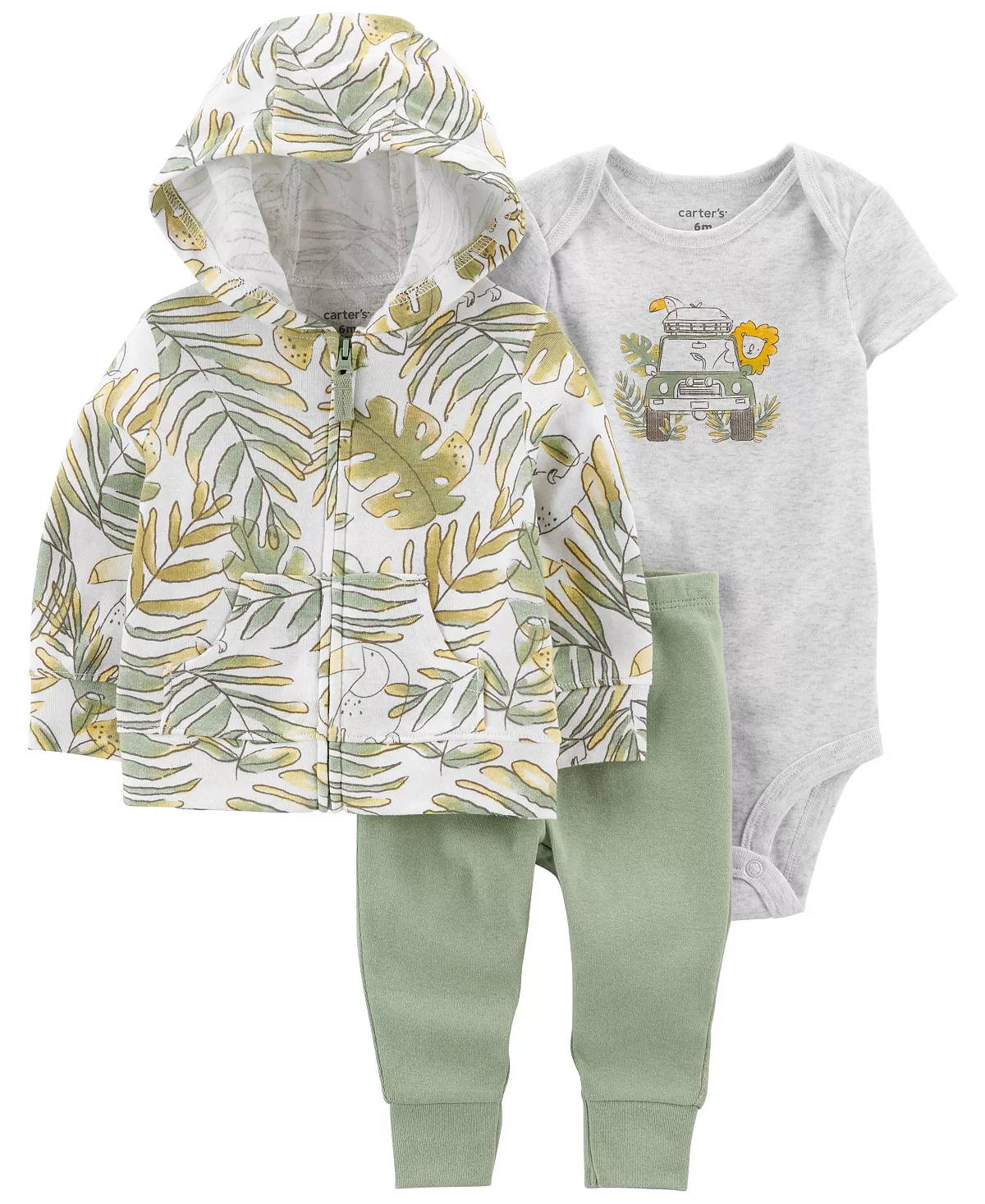 Made to match, this set of three is complete with a zip-up hoodie, short-sleeve bodysuit and a pair of coordinating pull-on pants.