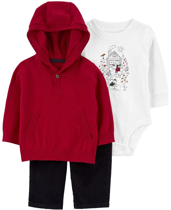 Crafted in soft fabric with three in one, this set is complete with a bodysuit, a pullover hoodie and a pair of corduroy pants.