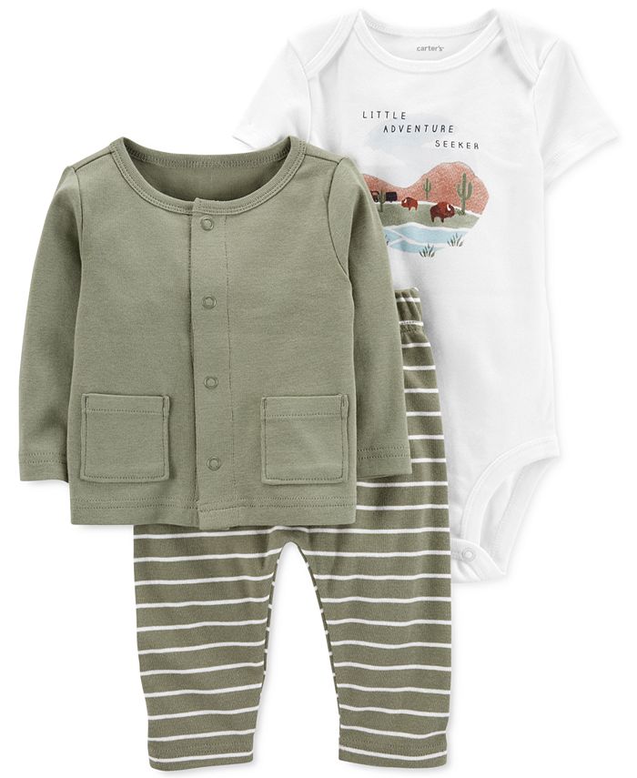 Crafted in soft cotton, this set from Carter’s is complete with a button-front cardigan, short-sleeve bodysuit and a pair of coordinating pants.