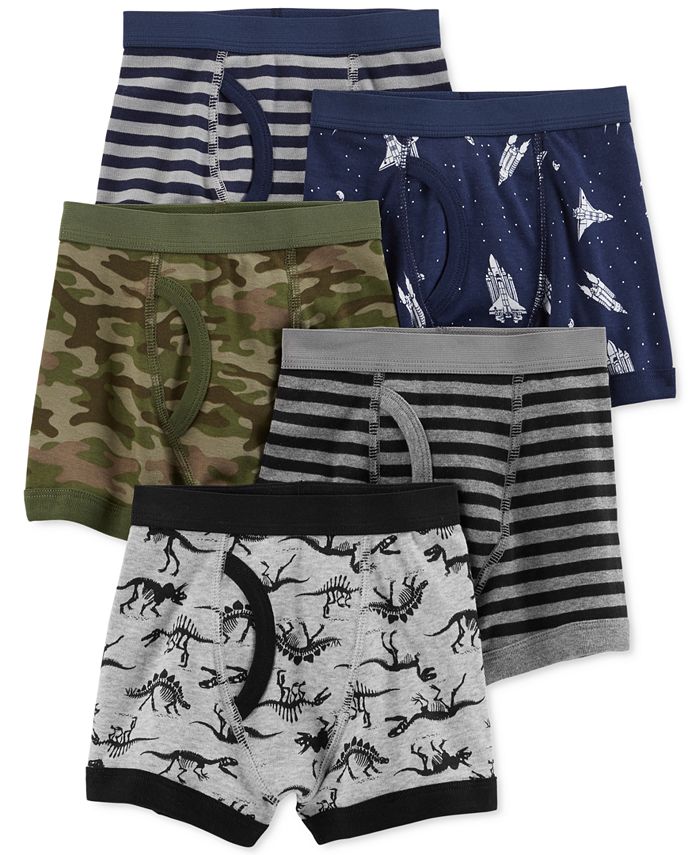 A convenient five-pack of cotton essentials, these comfy boxer briefs from Carter’s feature cool prints and stripes.