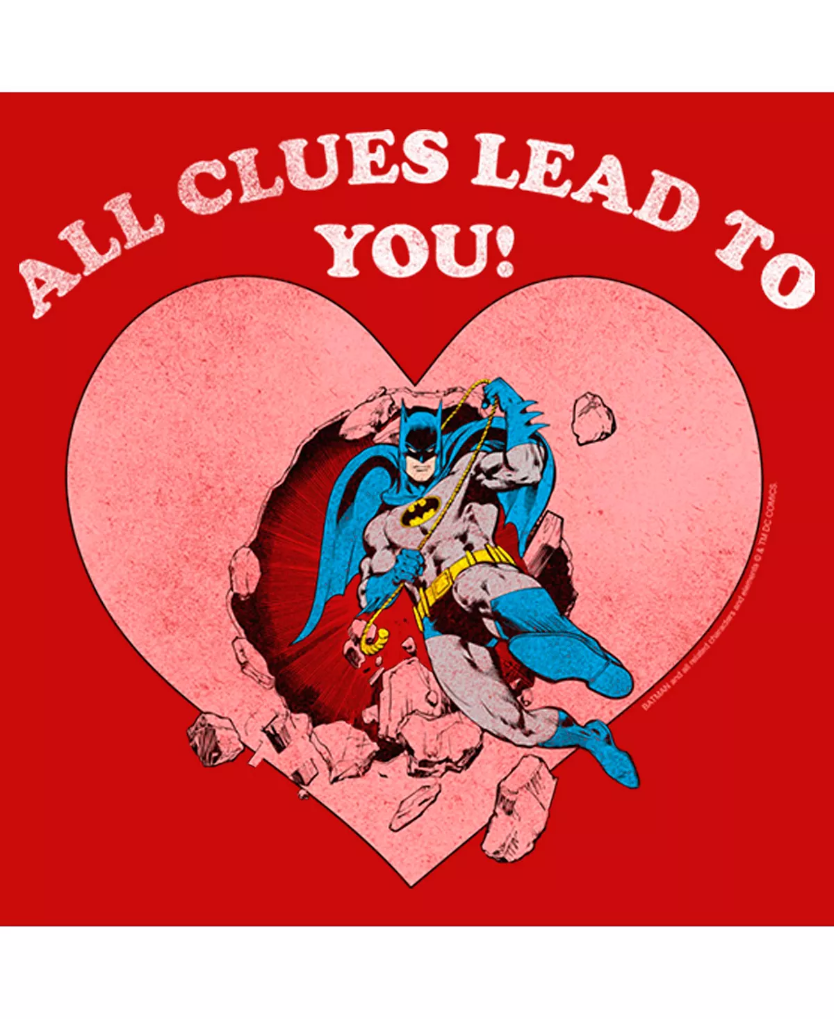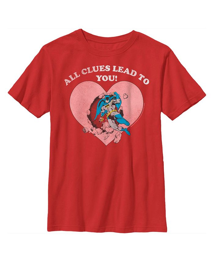 Get in the Valentine’s Day mood with this officially licensed Boys’ Red Warner Brothers Batman Valentine’s Day All the Clues Lead to You Tee! Featuring Batman smashing through a giant pink heart and the words “All The Clues Lead To You” above him, you are sure to attract all the Batman fans and mayb