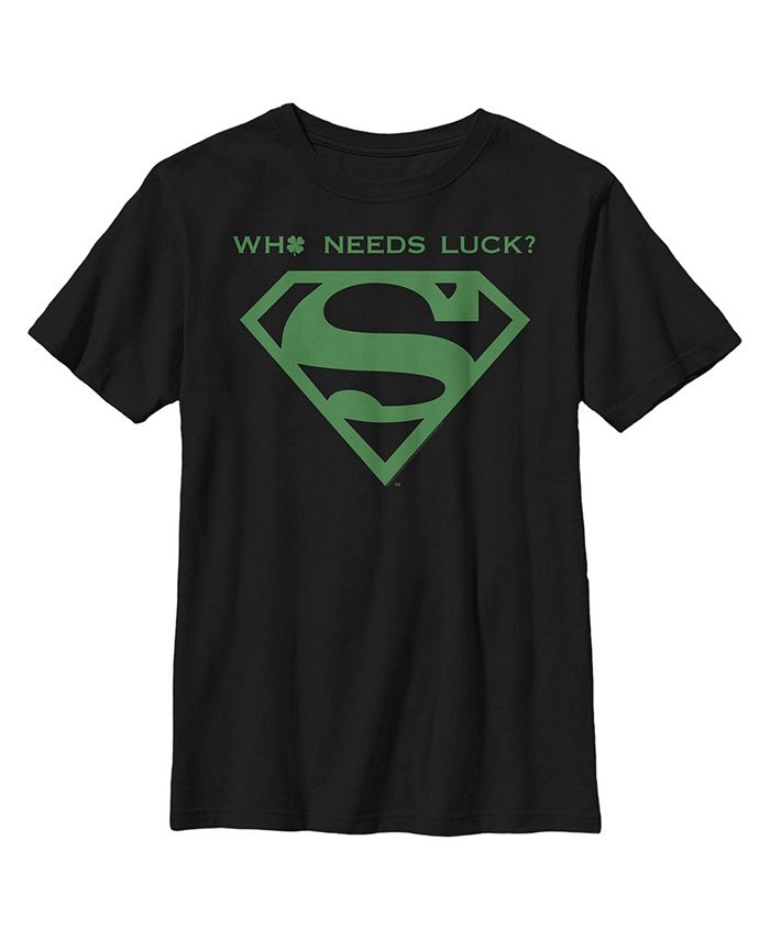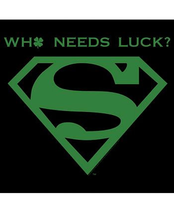- This design features the words “Who Needs Luck?” with the iconic Superman logo in green!