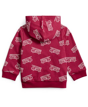 An allover fire truck print decorates this comfy front-zip hoodie from First Impressions.