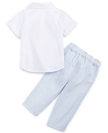 A sweet two-piece set from First Impressions, designed with a short-sleeve shirt and seersucker pants.