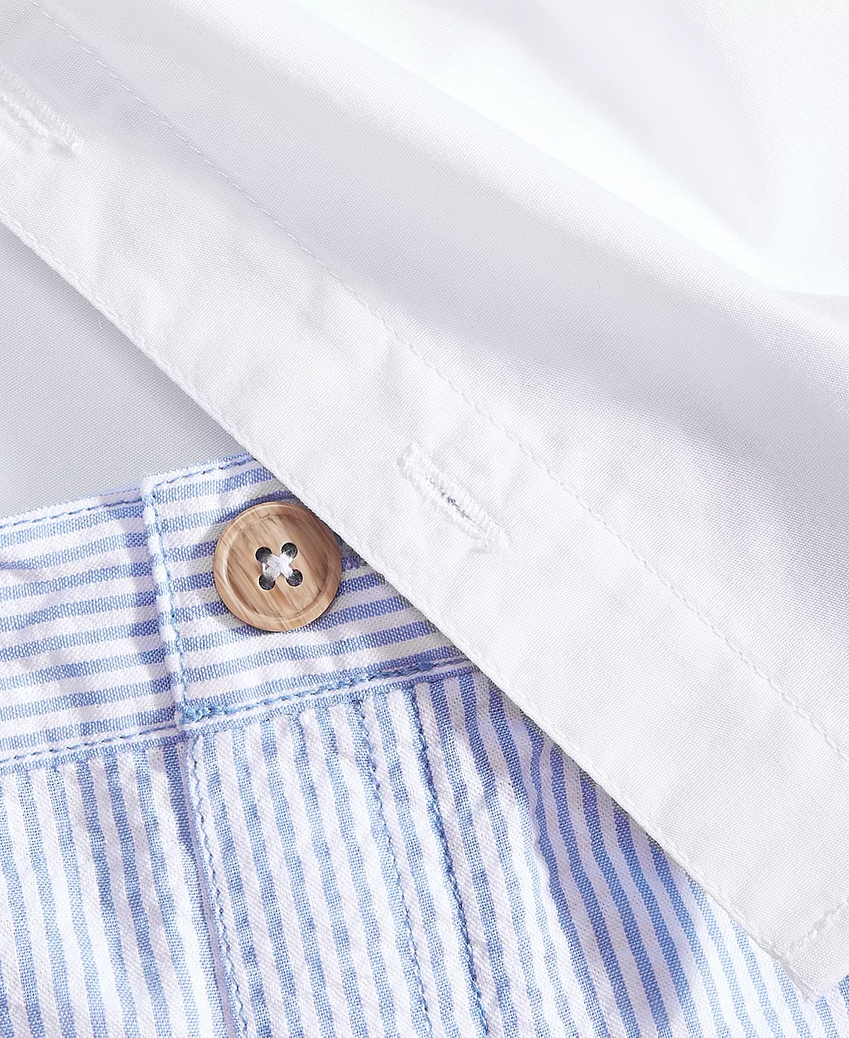 - Top: point collar with seersucker bowtie; front button placket; short sleeves; faux chest pocket with pocket square detail