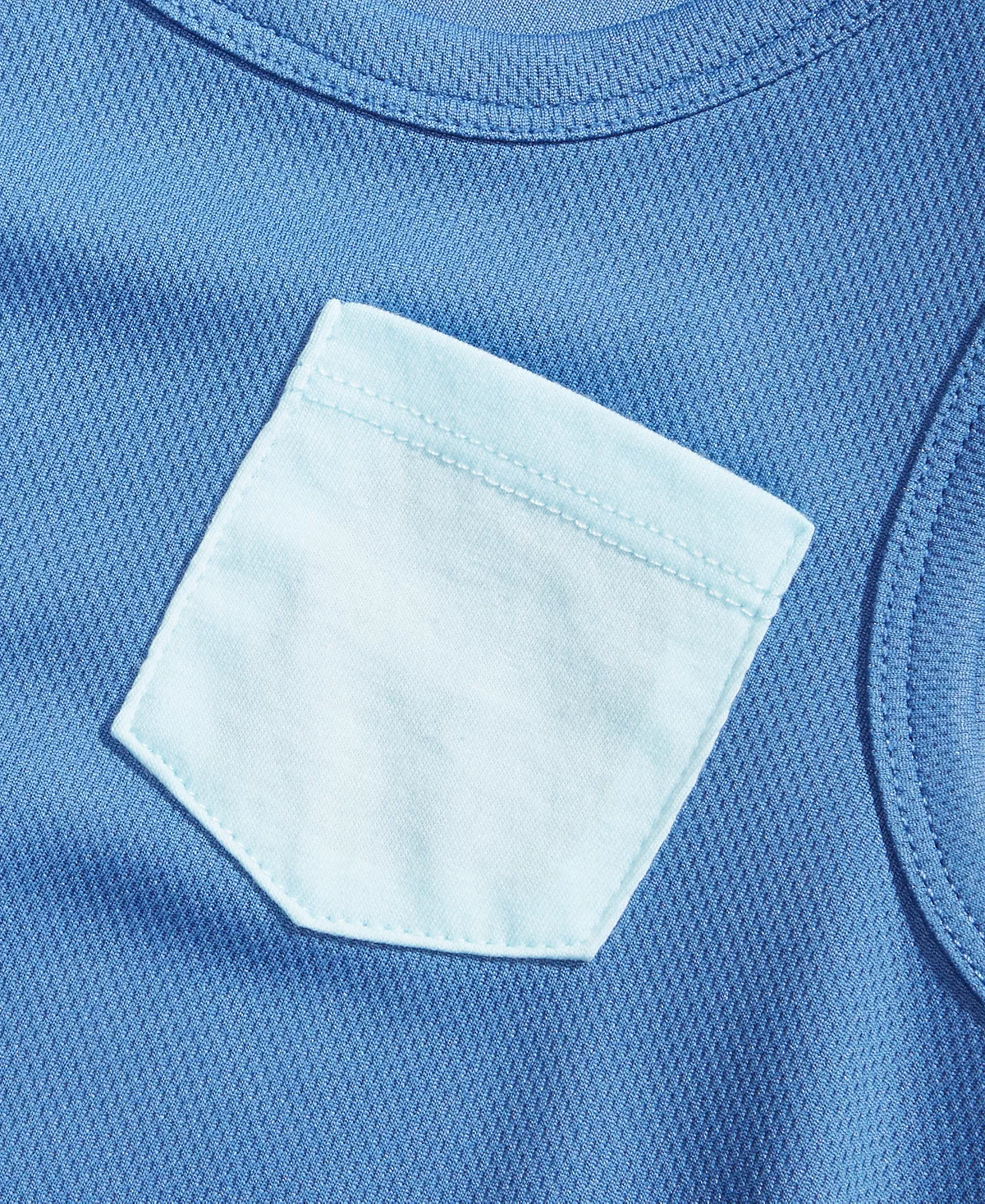 - Colorblocked styling; faux patch pocket at left chest; mesh fabric