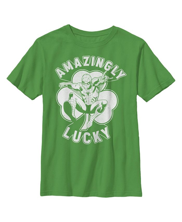 It’s your lucky day because you’ve got an entire team of superheroes to make sure you don’t get pinched with this awesome officially licensed Marvel St. Patrick’s Day Spider-Man Lucky Clover Boys’ Tee. This festive tee features a graphic of Spider-Man swinging on a web in a lucky clover and “Amazing