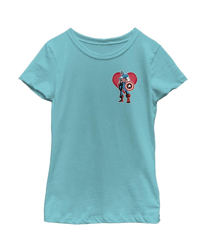 - Strut your stuff with this stylish new Valentine’s Day girls’ t-shirt that is perfect for your sweet valentine! Featuring a small graphic of Captain America standing tall on the upper left chest with a red heart in the background.