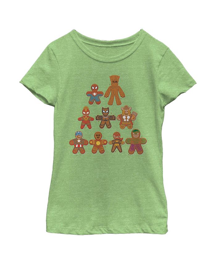 Lose yourself in the pages of a comic book or the movie adventure of a lifetime with your favorite Marvel superheroes this holiday season! This officially licensed Marvel Christmas Gingerbread Cookie Tree Girls’ Graphic T-Shirt features a gingerbread cookie tree with Spider-Man, Captain Marvel, Blac
