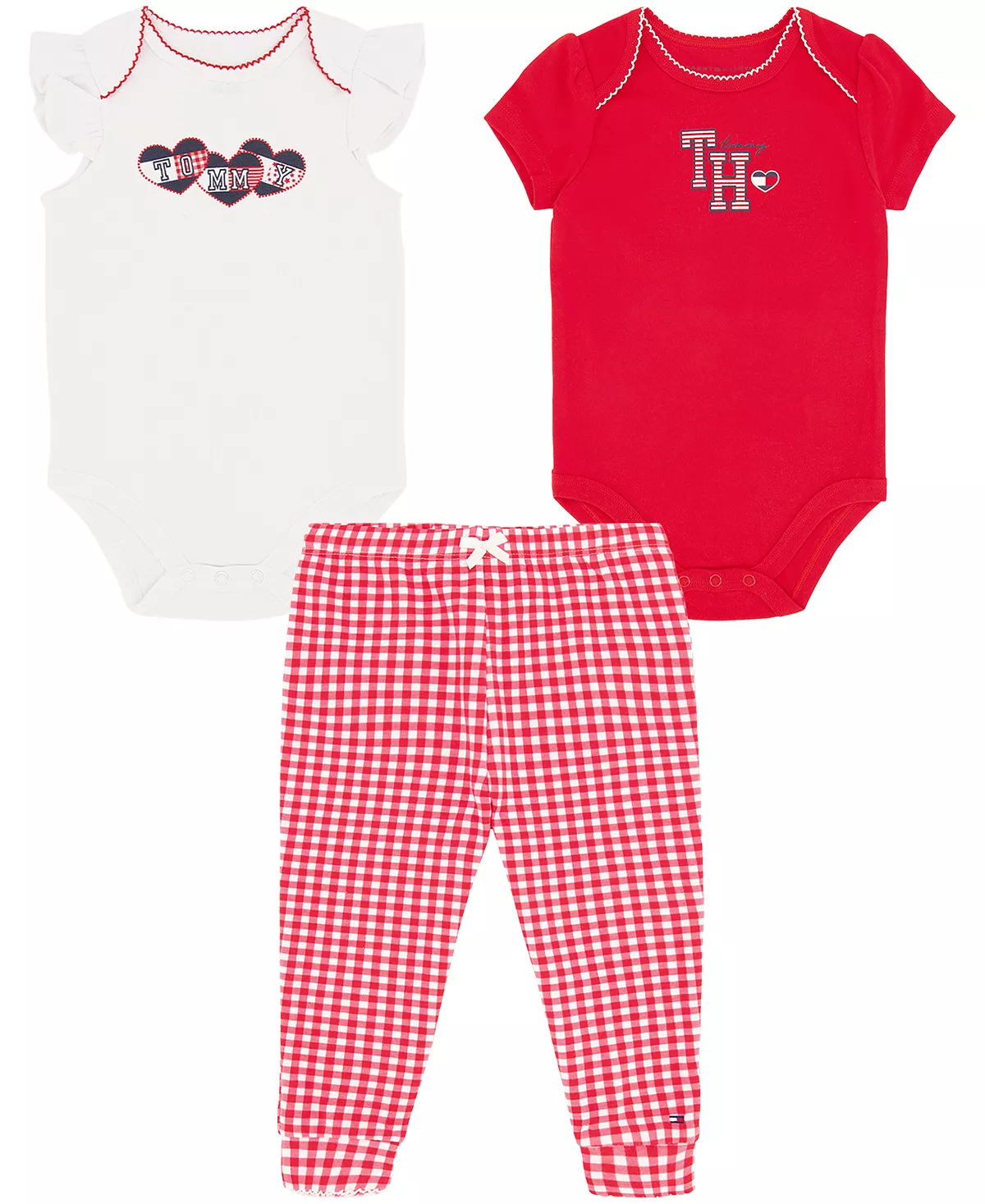 Tommy Hilfiger Baby Girls Crochet Trim Signature Bodysuits And Joggers, 3 Piece Set