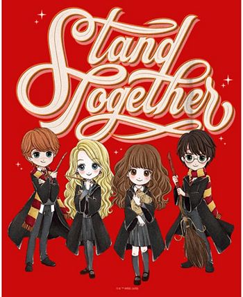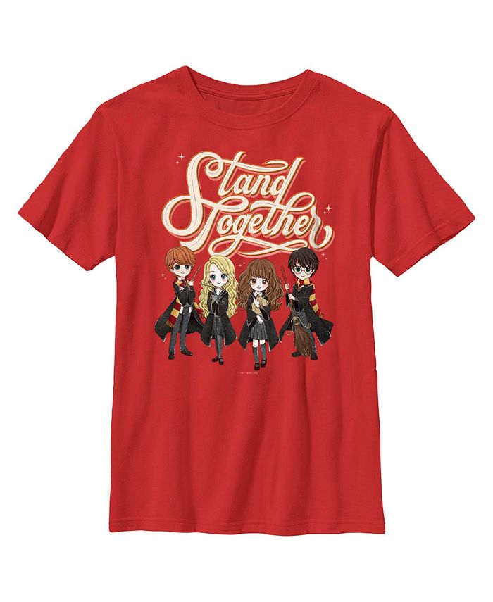 - Strut your stuff with this stylish boys’ t-shirt featuring a cool graphic of Ron, Luna, Hermione, and Harry in a cool animated style with the phrase “Stand together” printed above!